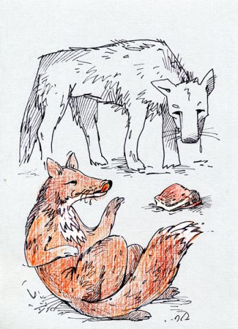 To sacījusi, lapsa sakampa speķa gabalu un sāka mieloties. Bet piemuļķotais vilks ar kurkstošu vēderu vilkās uz savu midzeni.
